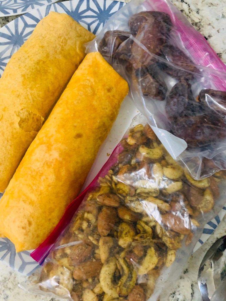 I carried over 3000cal with me and took a break to eat a well-balanced meal in the evening.